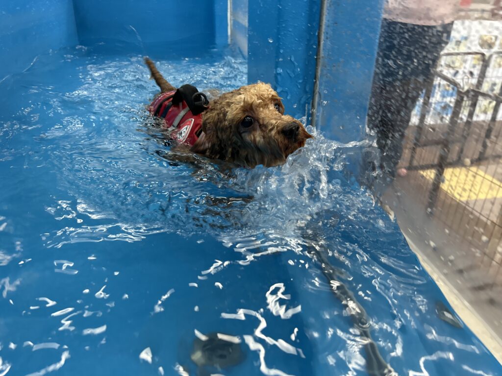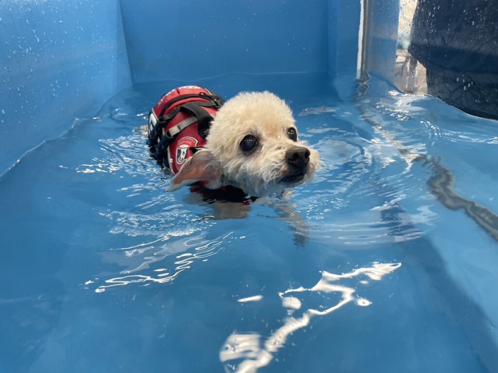 ライフジャケットなしの方がスイスイ泳げており、飼い主様やスタッフはびっくりです!!